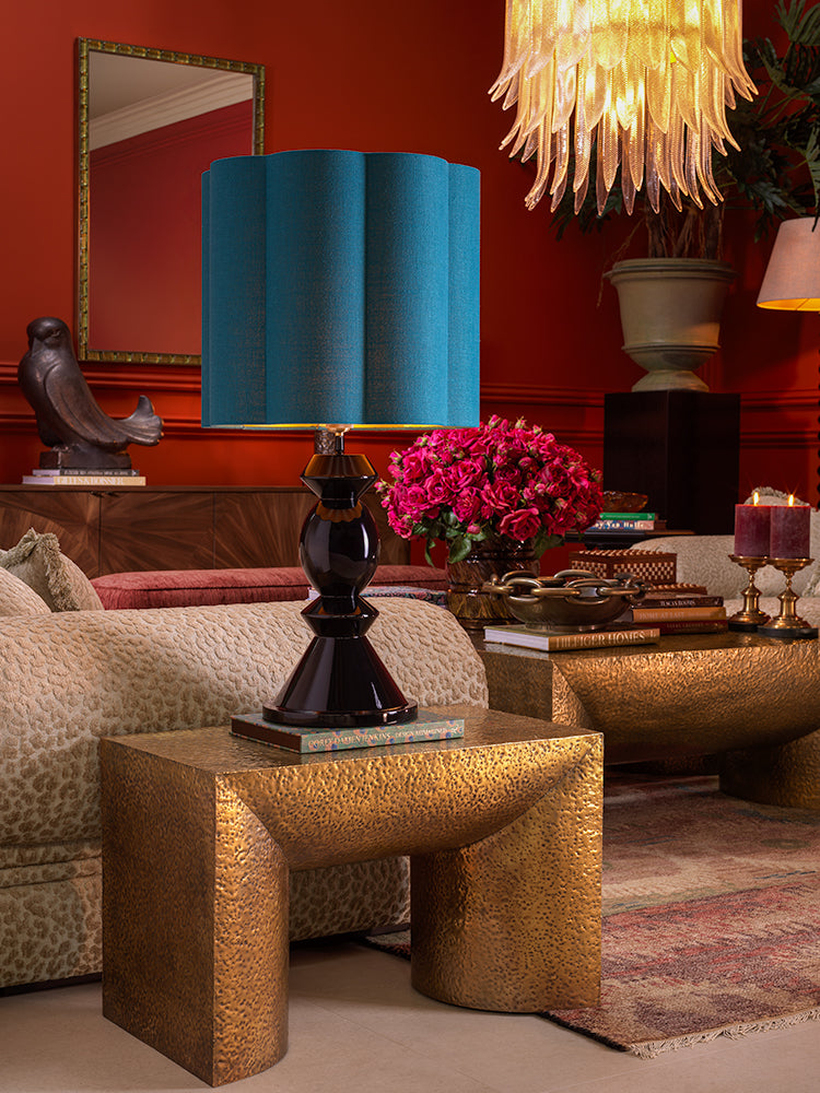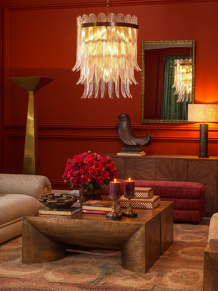 A dramatic living space infused with warmth, depth, and expressive color. Saturated crimson walls set a theatrical backdrop for sculptural seating and layered metallic accents, while jewel-toned lighting introduces contrast and visual intrigue. Plush textures and curated décor soften the bold palette, creating a refined balance between romance and modern sophistication. This curated room embraces confident design, where rich tones and elegant forms come together in a striking yet inviting composition.