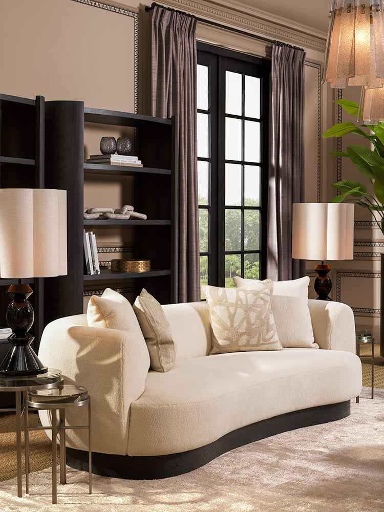 A refined living space that balances classic architectural framing with modern comfort. Soft, sculptural seating anchors the room, complemented by layered stone tables and tactile upholstery that introduce depth and warmth. Dark-framed windows and tailored drapery create contrast and symmetry, while open shelving adds a curated, residential feel. Warm pendant lighting softly illuminates the setting, enhancing the neutral palette and inviting textures. This curated room offers a timeless interpretation of modern elegance, grounded in balance, proportion, and understated luxury.