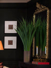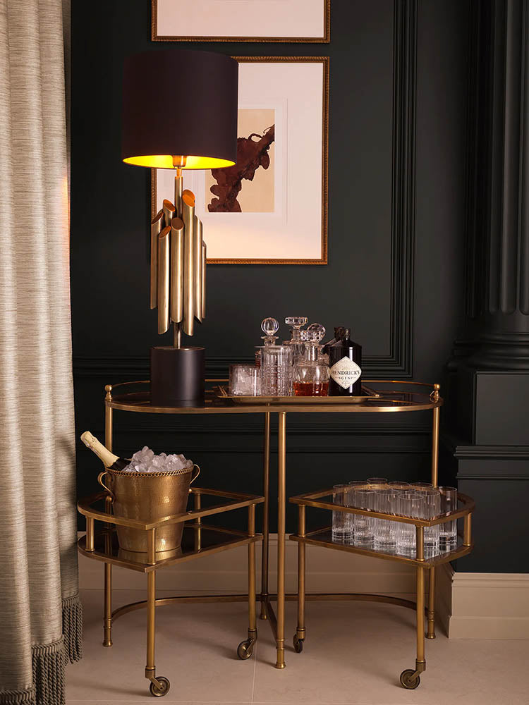 A richly layered living room where classic architecture meets modern warmth. Deep charcoal walls and ornate moulding create a dramatic backdrop, while soft cream seating and warm amber lighting introduce balance and comfort. Accents of rust, gold, and natural stone add depth and sophistication, complemented by sculptural decor and lush greenery. Centered around a refined fireplace, this curated room blends timeless elegance with contemporary warmth, offering an inviting yet opulent atmosphere.
