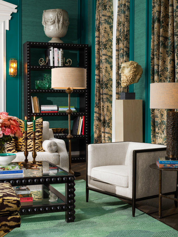 A richly composed living space defined by jewel-toned walls, classical symmetry, and layered texture. Deep teal paneling frames the room with architectural presence, while soft ivory seating and sculptural accents create balance and comfort. Dark shelving, warm metallic lighting, and curated décor add depth and refinement, complemented by botanical textiles and subtle pattern play. This curated room blends timeless European influence with expressive color, offering a bold yet sophisticated interpretation of modern luxury.