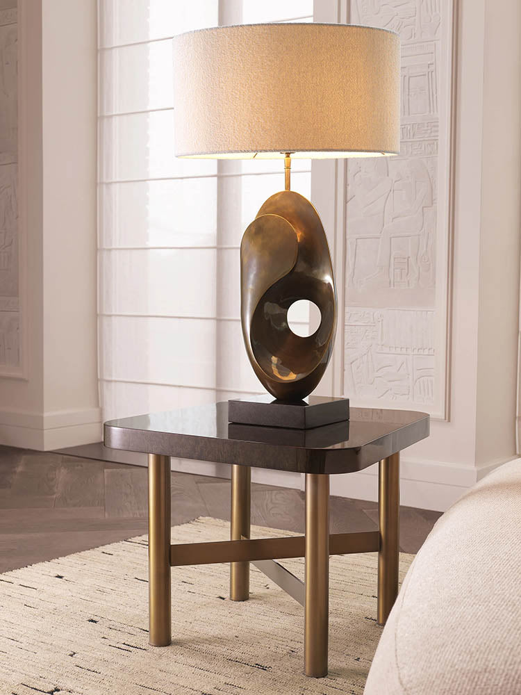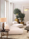 A serene modern living space defined by soft sculptural silhouettes and refined symmetry. Plush ivory seating anchors the room in quiet comfort, while brass accents and geometric tables introduce warmth and structure. Tall greenery adds height and organic contrast, enhancing the airy feel created by the expansive window wall. Soft, diffused lighting completes the atmosphere, resulting in a harmonious setting that balances contemporary elegance with natural tranquility.