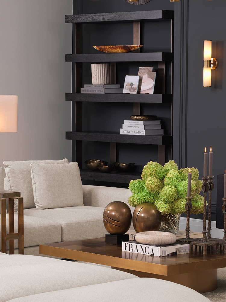 This living space balances contemporary warmth with dramatic contrast, pairing creamy upholstery against a deep charcoal backdrop for a striking, gallery-inspired composition. Layered metallic accents in brushed gold introduce refined luminosity, while sculptural décor and sleek shelving add architectural depth. The generous sectional anchors the room with inviting comfort, complemented by tailored lighting and thoughtfully curated accessories. Elegant, modern, and richly atmospheric, this room captures the essence of elevated living through contrast, texture, and clean-lined sophistication.