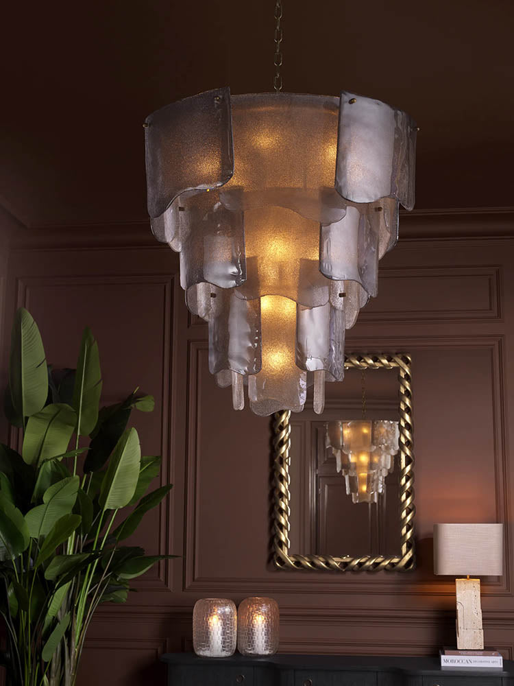 A richly intimate living space defined by deep chocolate tones, sculptural seating, and warm ambient light. The tufted lounge pieces bring a tailored softness that contrasts beautifully with the bold, paneled walls. A statement chandelier glows overhead, its layered glass casting a soft, atmospheric radiance. Brass accents, lush greenery, and modern decor add depth and refinement, while textured rugs and drapery lend warmth. This curated room blends moody elegance with sculpted comfort for a luxurious, contemporary retreat.