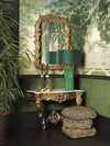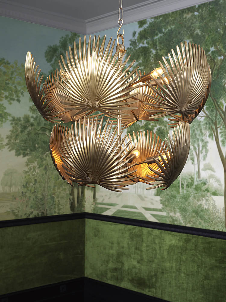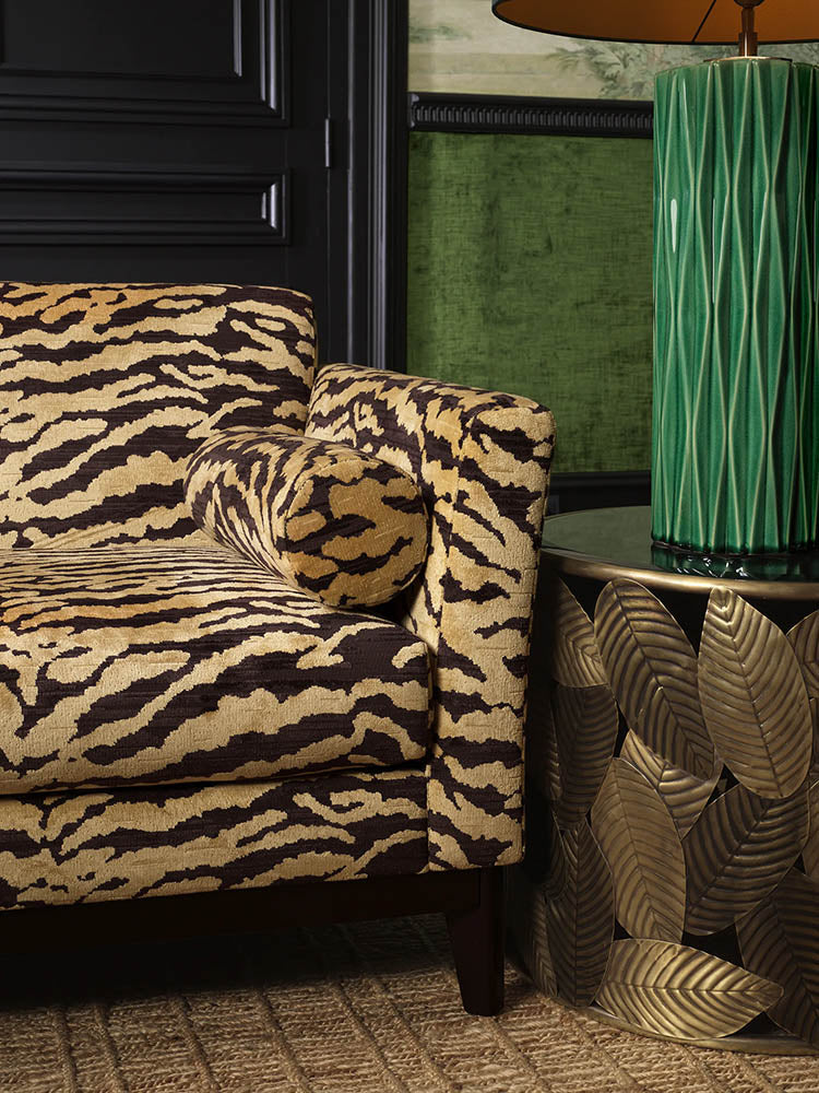 A lavish living space where dramatic pattern, rich color, and sculptural detail converge. The bold tiger upholstery sets an unapologetically glamorous tone, balanced by deep green walls, gilded console tables, and ornate mirrors that reflect timeless European influences. A sculptural brass chandelier crowns the room with theatrical elegance, while lush greenery and jewel-tone accents enhance the layered, maximalist atmosphere. This curated room celebrates bold expression and refined luxury in perfect harmony.