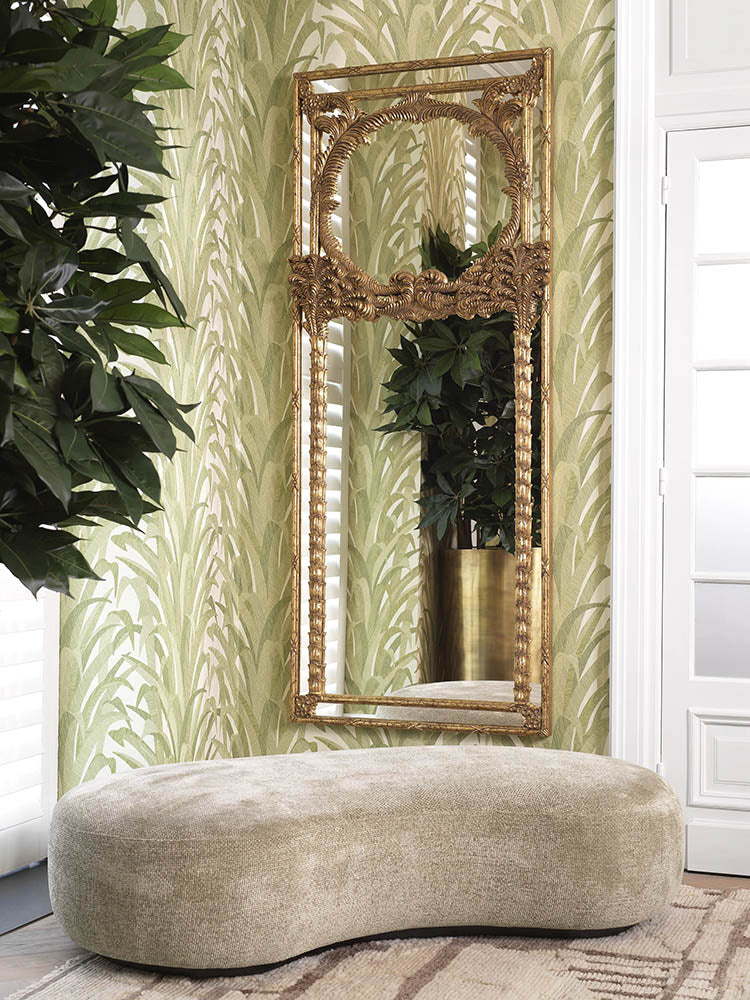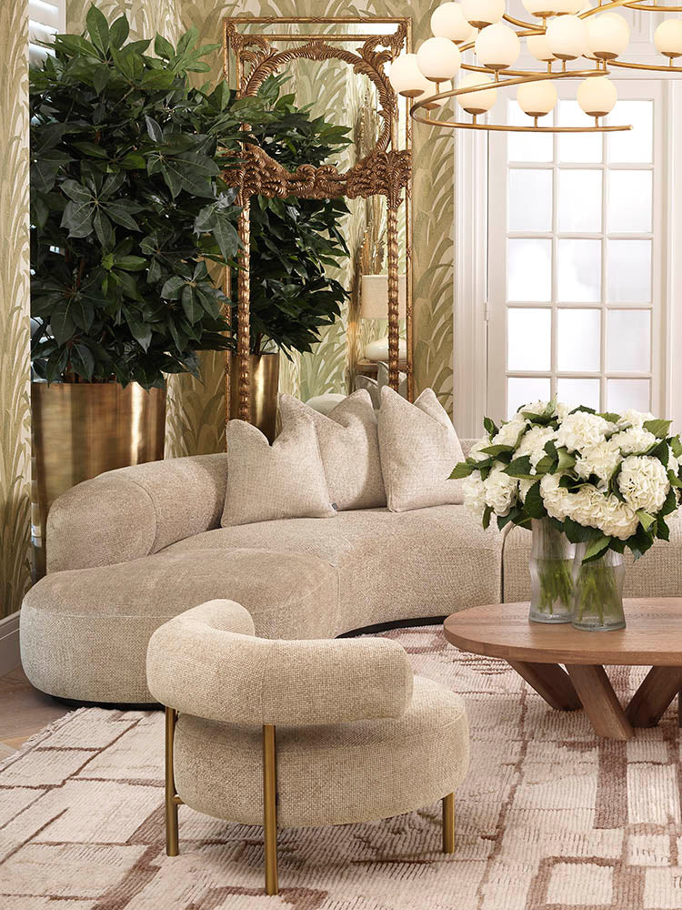 A welcoming living space shaped by soft curves, warm neutrals, and lush botanical accents. Sculptural seating creates a graceful, flowing layout, while natural wood tables and layered textures add depth and comfort. The leafy green palette from the wallpaper and foliage introduces a soothing, nature-inspired atmosphere, complemented by warm ambient lighting and refined decorative details. This curated room blends organic warmth with modern elegance, offering a serene retreat with an inviting, contemporary character.