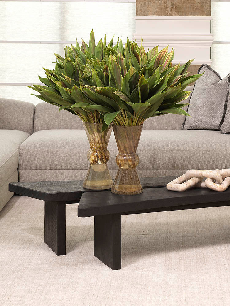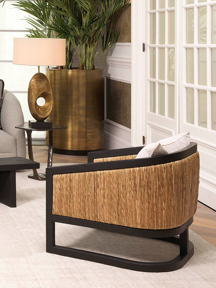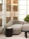 This contemporary living space blends soft sculptural seating with warm natural accents for a relaxed yet elevated atmosphere. Textured brass planters, lush greenery, and a mix of black and wood tones introduce organic depth, while the layered lighting and stone-inspired wall panels add gentle sophistication. The neutral palette keeps the room calm and inviting, allowing each material and shape to stand out with understated elegance. A harmonious balance of comfort and modern refinement defines this curated setting.