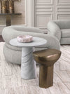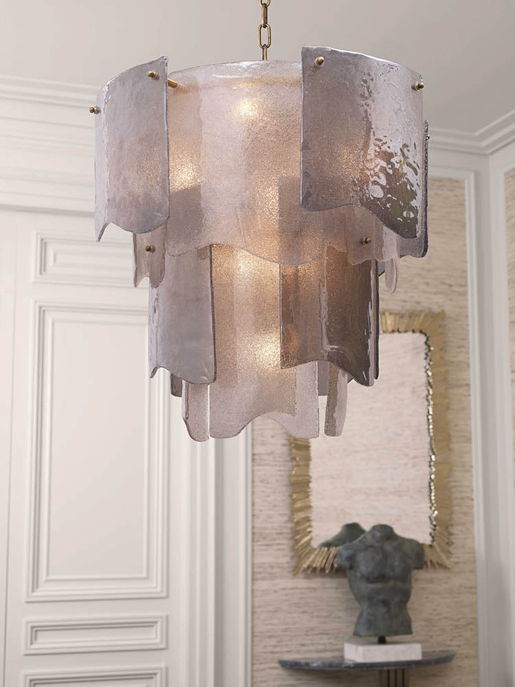 A serene living space defined by gentle curves, layered neutrals, and refined architectural detailing. Plush sculptural seating anchors the room in comfort, while textured walls, brass accents, and statement mirrors add depth and elegance. The softly diffused light from the chandelier enhances the calm palette, creating a warm, inviting glow. Balanced greenery and curated décor complete the atmosphere, offering a sophisticated retreat that feels both modern and timeless.