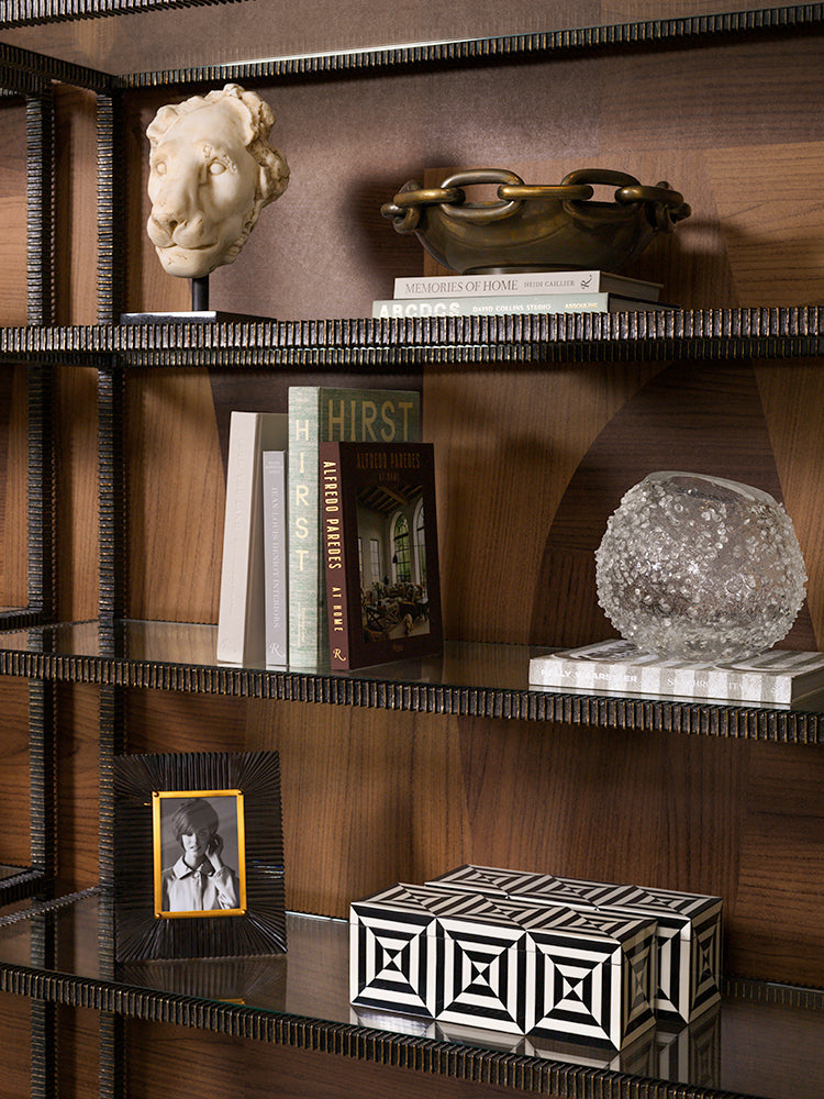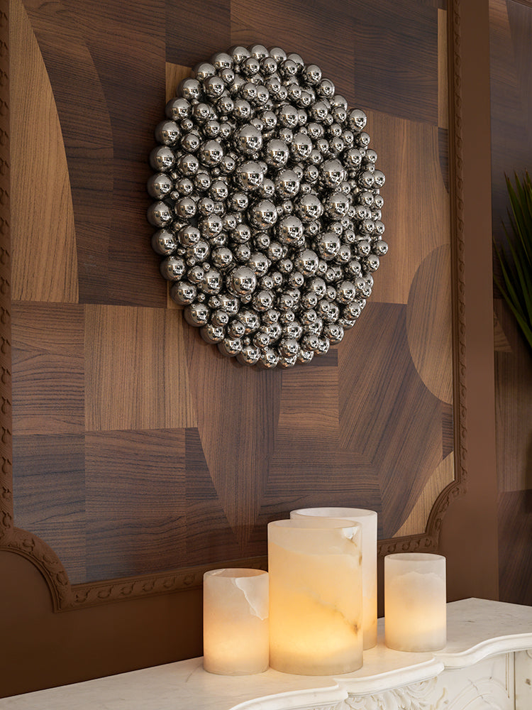 A sophisticated living space grounded in rich wood tones and balanced architectural framing. Sculptural seating in soft neutrals is paired with deep, layered textures that add warmth and dimension. The carved fireplace serves as a classical anchor, while modern tables and ambient lighting introduce contemporary contrast. Lush greenery softens the composition, creating a calm, inviting atmosphere that feels both timeless and thoughtfully curated. This room blends heritage detail with modern refinement in perfect equilibrium.