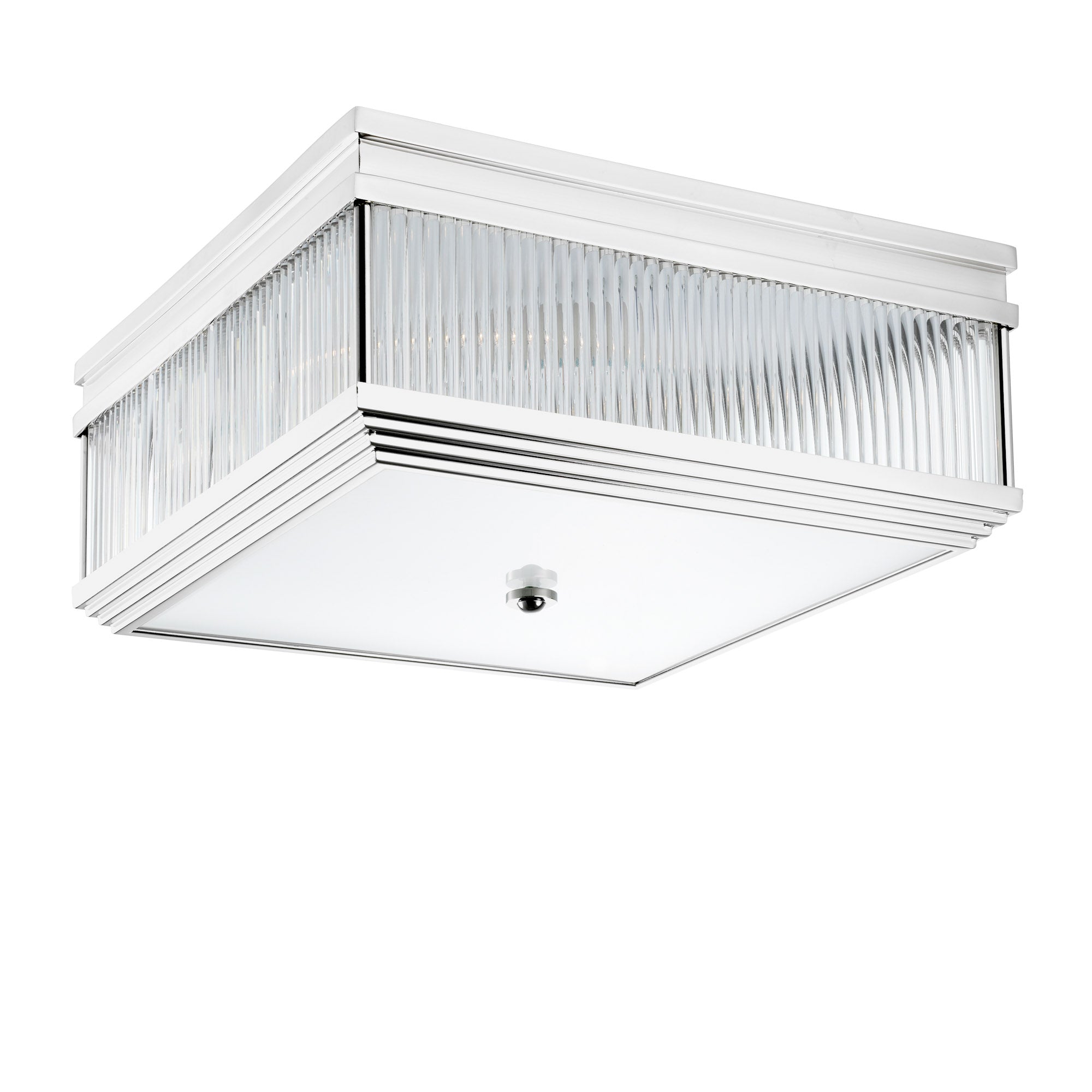 Rods of clear glass are set in the side panels of the square frame to create a sparkling effect. The frosted glass diffuser at the bottom hides all bulbs from view and eliminates any glare.
