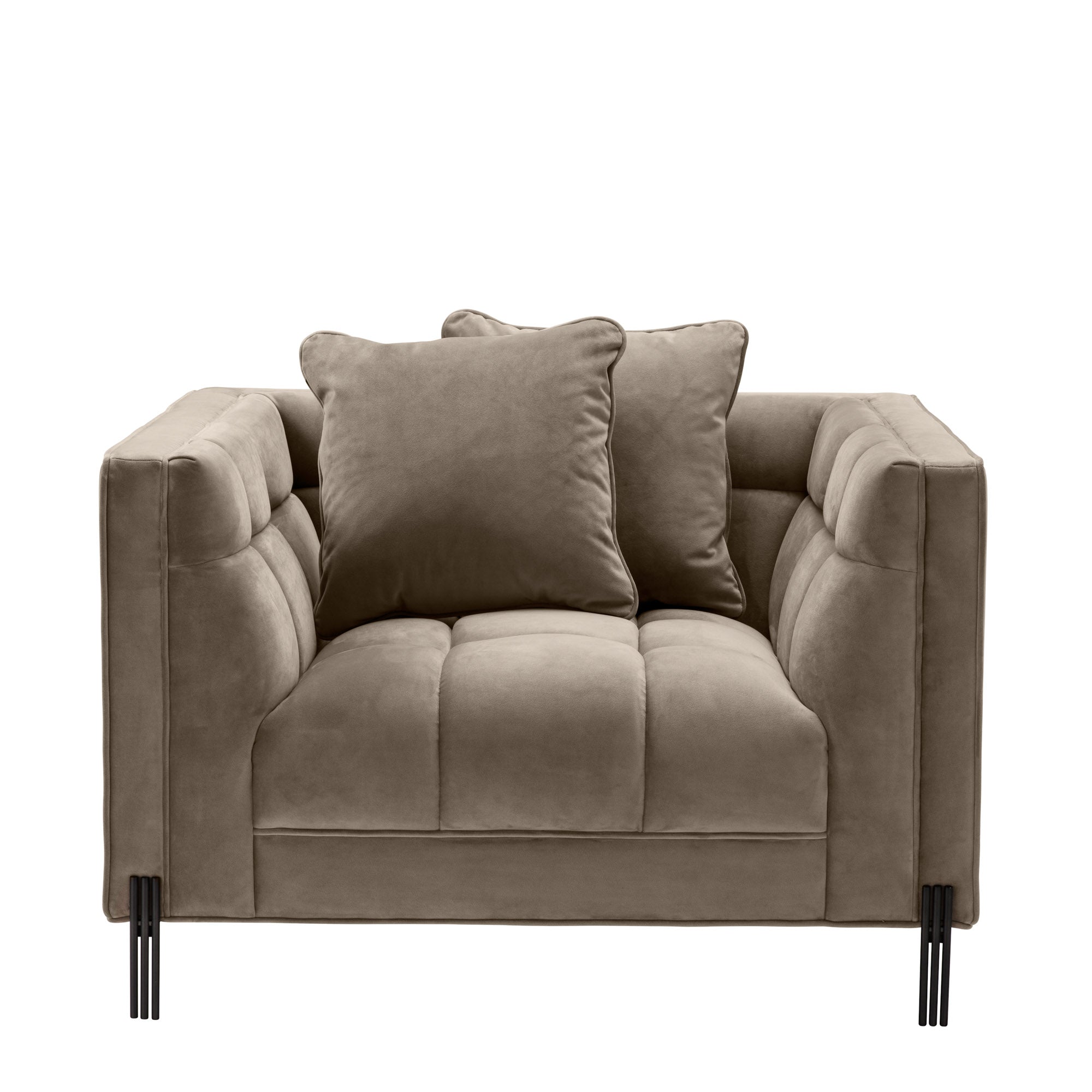 Featuring a t-shape, its backrest forms a whole with the armrests. This elegant modern armchair comes in a tufted upholstery in mellow Savona greige velvet, with two square throw cushions.