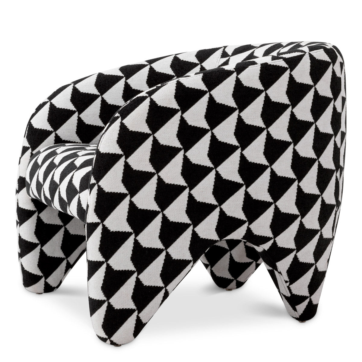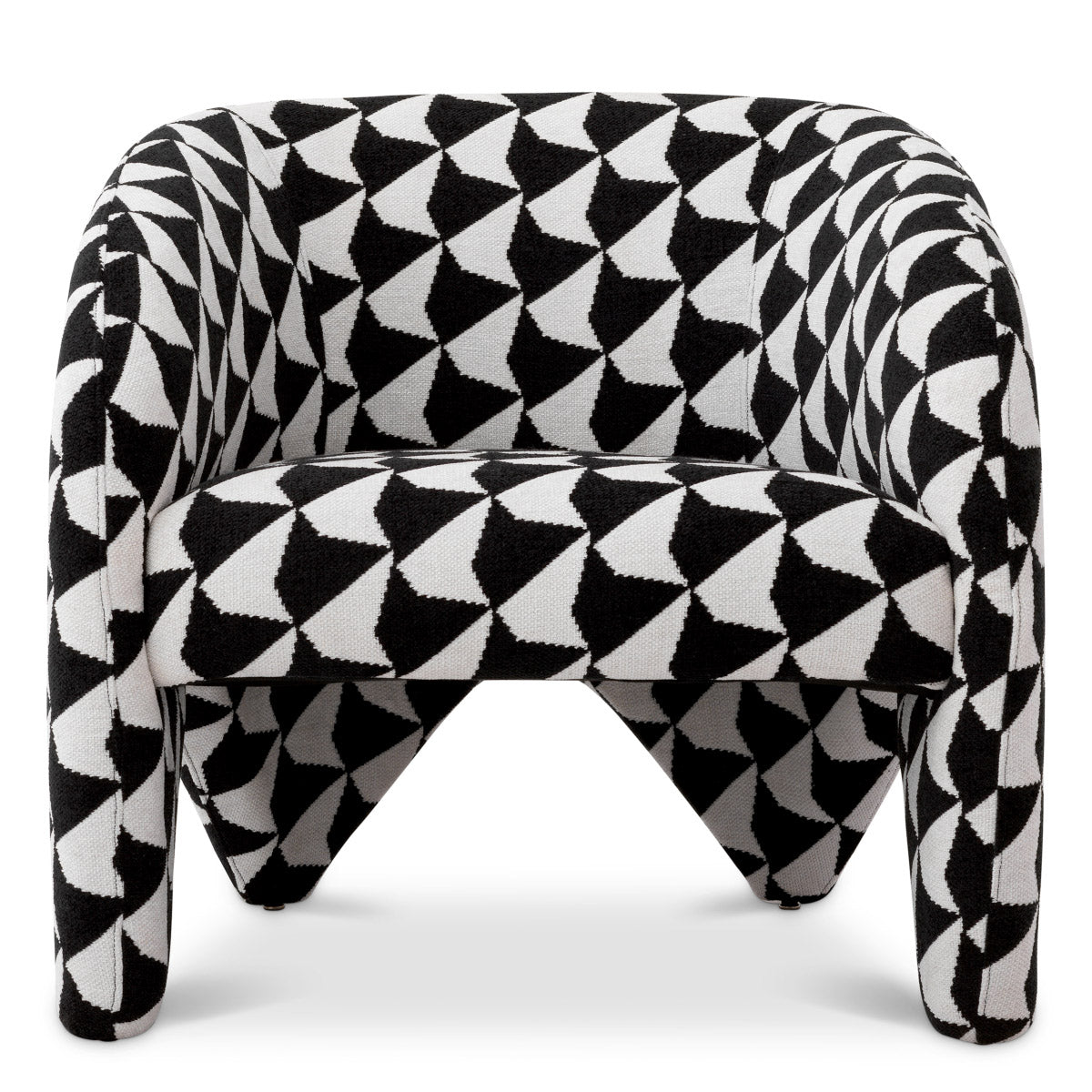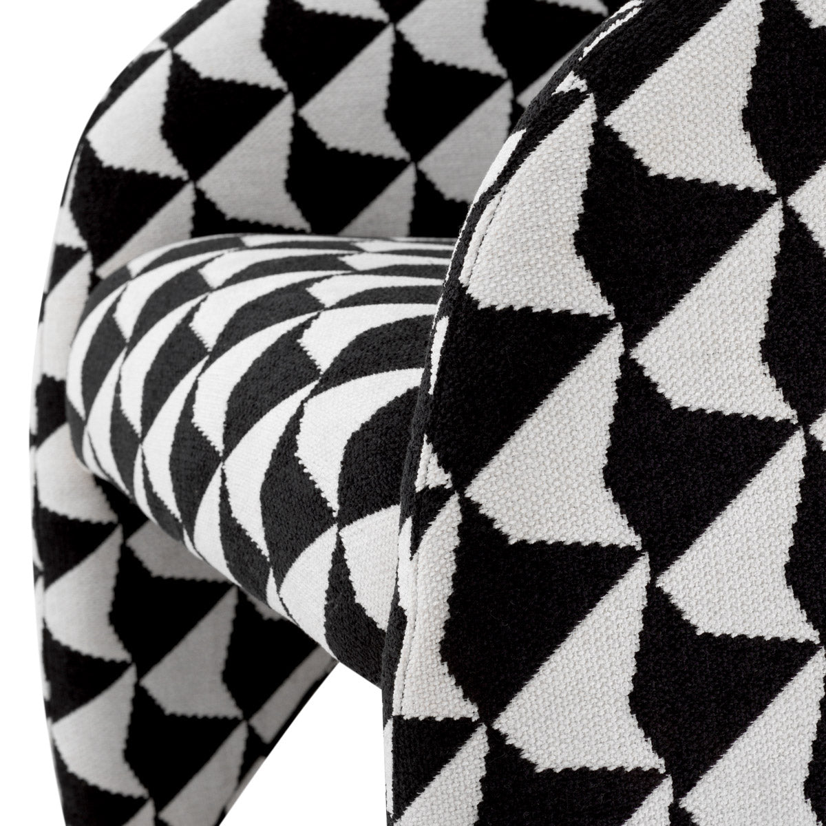 This striking chair is upholstered in Zenith black and white fabric, exuding elegance and making a powerful statement. Meticulously crafted with impeccable detail and a sophisticated silhouette, it effortlessly elevates any room it graces.