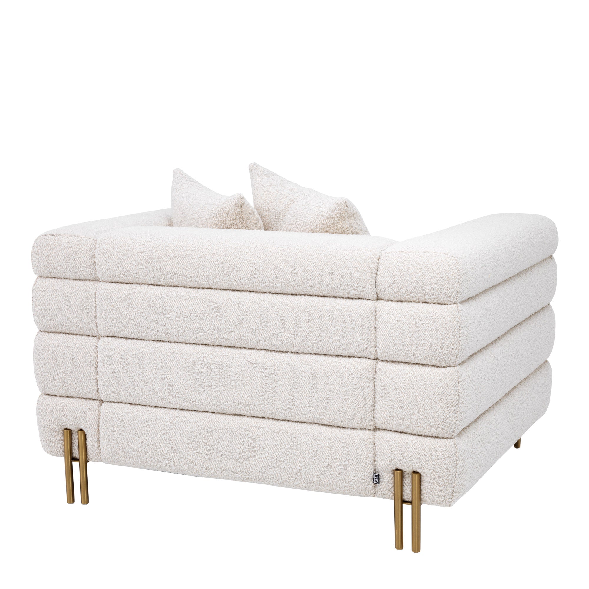 Thoughtful finishes and curated textures invite daily use while preserving a quietly luxurious presence. The design is crafted in Brass, Fabric, completed with Bouclé cream, brushed brass finish legs, showcasing the brand’s focus on texture and depth.