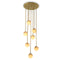 A series of spherical diffusers, carved from alabaster and softly illuminated from within, hang in rhythmic suspension from a circular brass canopy.