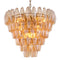 This gorgeous tapered chandelier with antique brass finish features diamond-shaped tubes of amber glass that let light fall through, creating a fascinating light display. Also available in a large version.