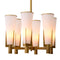 Its rich antique brass finish is paired with a bold geometric design that evokes the retro aesthetic of the 1950s and 1960s. Made of white glass and adorned with an antique brass rim, six cone shaped architectural shades complete its Mid-Century Modern look.