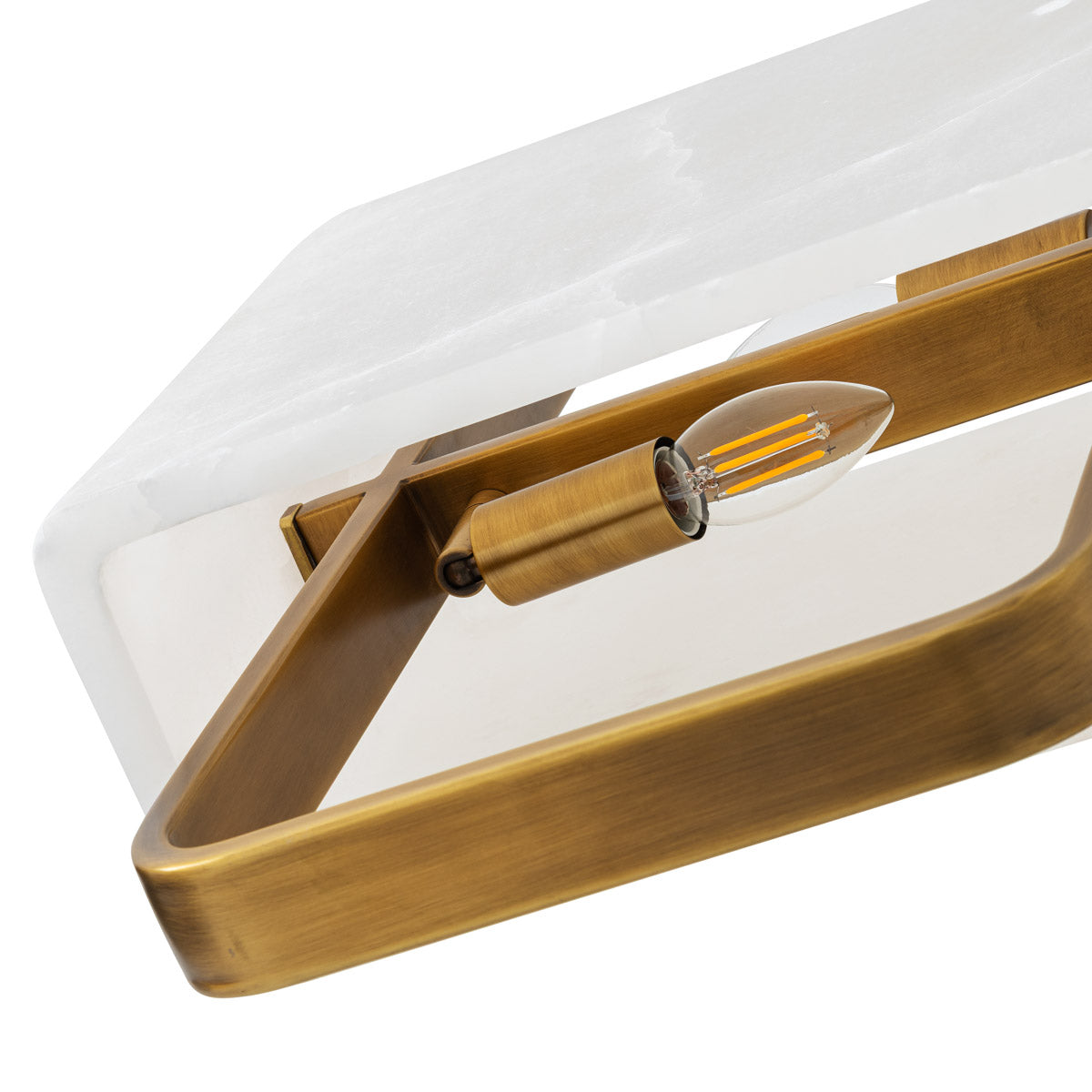 A luminous alabaster cube serves as the fixture’s centerpiece, its softly veined surface diffusing light into a warm, ambient glow. Floating within a minimalist brass frame, the composition achieves a perfect equilibrium between weight and illumination.