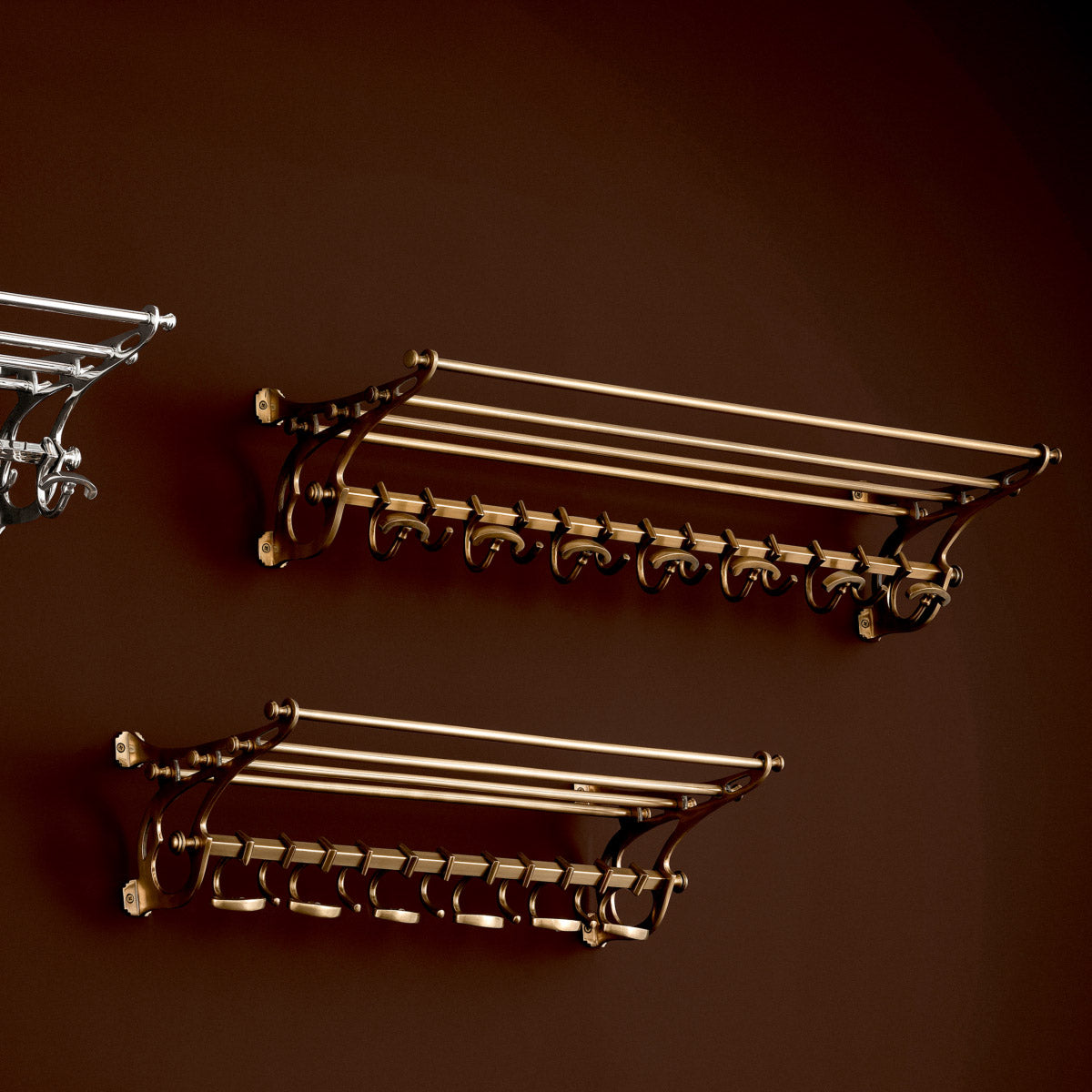 This nostalgic wall mounted coat rack features 13 hooks for hanging overcoats and jackets and a top shelf for gloves, hats and the like. Crafted to Eichholtz standards, it balances timeless European sensibility with modern ease — a statement design that layers comfortably into living, dining, or bedroom settings.