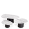 Each design has a pebble-shaped tabletops and a cylindrical black base. Featuring a striking ceramic marble-look surface with a monochrome color palette, each design adds a dash of decadence to your décor.
