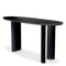 The table features an organic and free-form shape, crafted from black veneer with elegantly curved ellipse legs that enhance the overall aesthetic. The console table′s design is bold and striking, perfect for adding a contemporary feel to any living space.