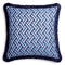 This exquisite design, part of the exclusive Doris collection, boasts a geometric pattern on opulent fabric, accentuated by dark blue fringe accents. The vibrant blue Doris print on a white backdrop adds a botanical appeal, reminiscent of exotic equatorial flora.