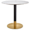 It stands on a black metal pole with a brushed brass base. A round top with ceramic marble look and swirling vein pattern elevates the table’s style and sophistication.