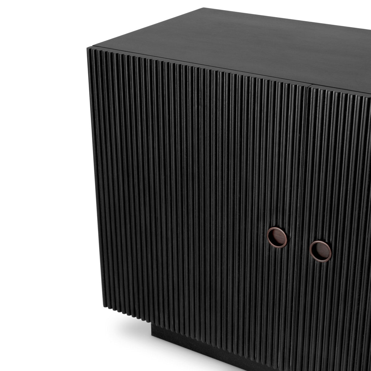 Sleek and stylish, this sideboard with ribbed door panels adds a touch of Mid-Century Modern chic to your living space. Its vintage-inspired design has a solid body with charcoal grey oak veneer and bronze finish hardware.