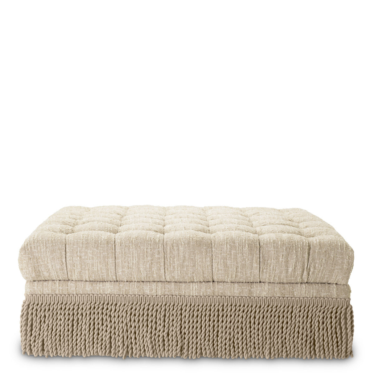 Upholstered in the exquisite Bouclé Sonata Cream fabric, this ottoman features stylish fringes that enhance its visual appeal. The ottoman′s cushioned top provides a comfortable seating or lounging experience.