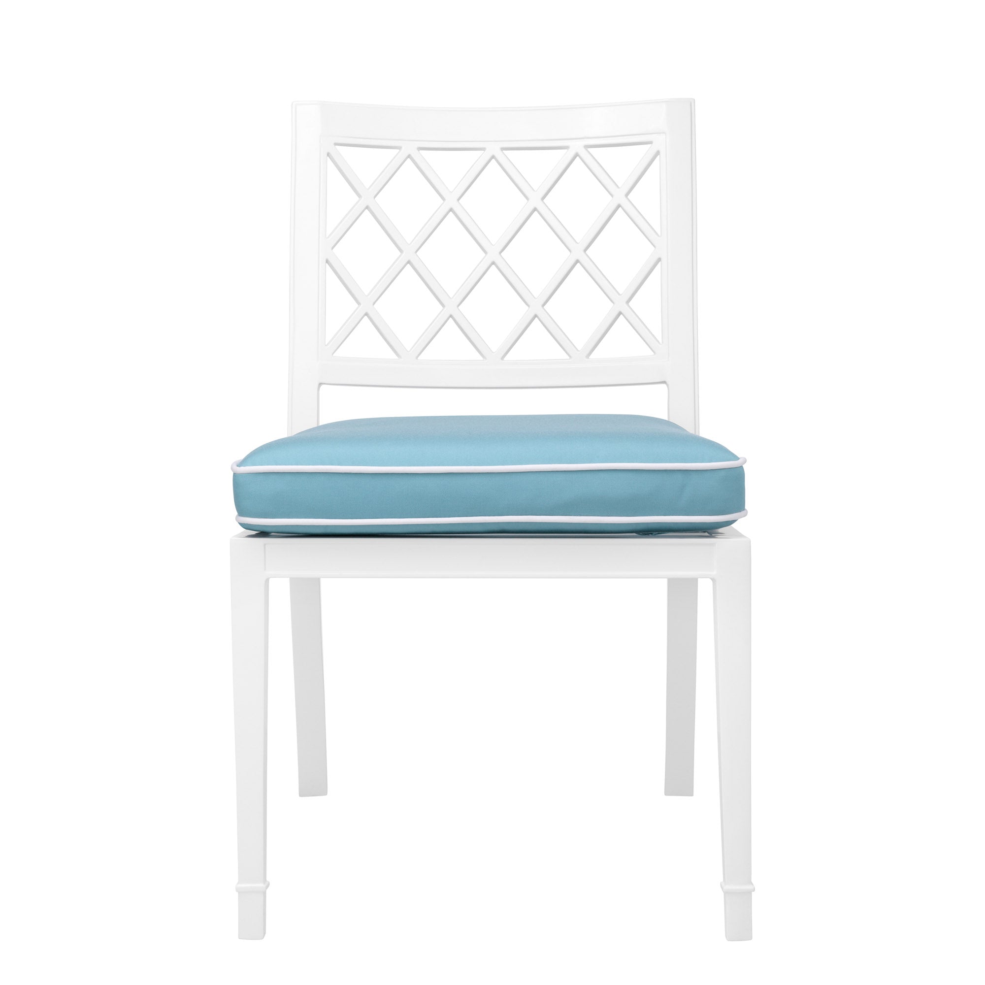 With its sophisticated look and white finish frame, this attractive dining chair is sure to be a stylish and practical addition to your outdoor living space. It comes with a comfortable seat cushion in mineral blue Sunbrella fabric with white piping.