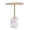 The round brushed brass table top is embellished with raised edges. It sits on a sleek stem which firmly rests on a block of white marble with grey veins, giving it a chic and elegant look.