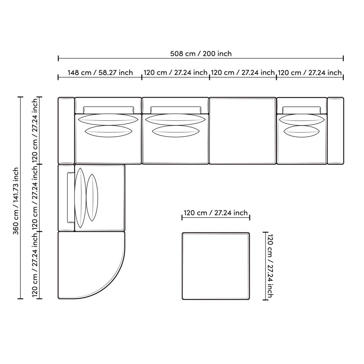 - Dimensions: W. 152.76″ | D. 141.73″ | H. 30.31″ | SD. 20.47″ | SH. 15.75″ | AH. 20.87″