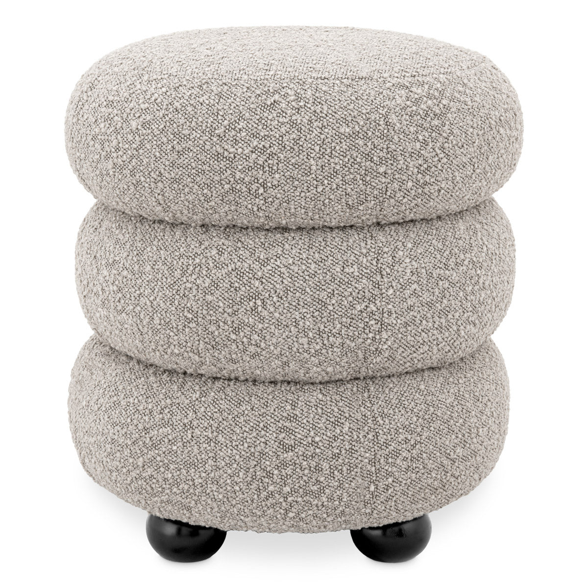 Revered for its sumptuously tufted cushioning and alluringly, contemporary low profile, the stool is accentuated by its unique marshmallow-like curves in bouclé grey upholstery. Black feet round out the captivating nature of The Tulum.
