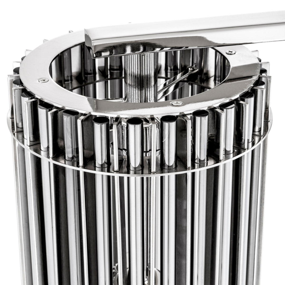 The sleek lamp base with nickel finish has a sculptural exterior with smoke glass rods that encourages an enchanting, atmospheric ambience. Crafted to Eichholtz standards, it balances timeless European sensibility with modern ease — a statement design that layers comfortably into living, dining, or bedroom settings.