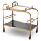 Featuring a remarkably elegant frame with a brushed brass finish, this luxury bar cart has a removable tray with clear glass and a lower shelf of black glass. Two racks hold the bottles in place, whilst castor wheels make navigating a breeze.