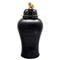 The black shouldered jar and its domed lid with gold colored rim and foo dog finial brings Ming style into your modern décor. Crafted to Eichholtz standards, it balances timeless European sensibility with modern ease — a statement design that layers comfortably into living, dining, or bedroom settings.