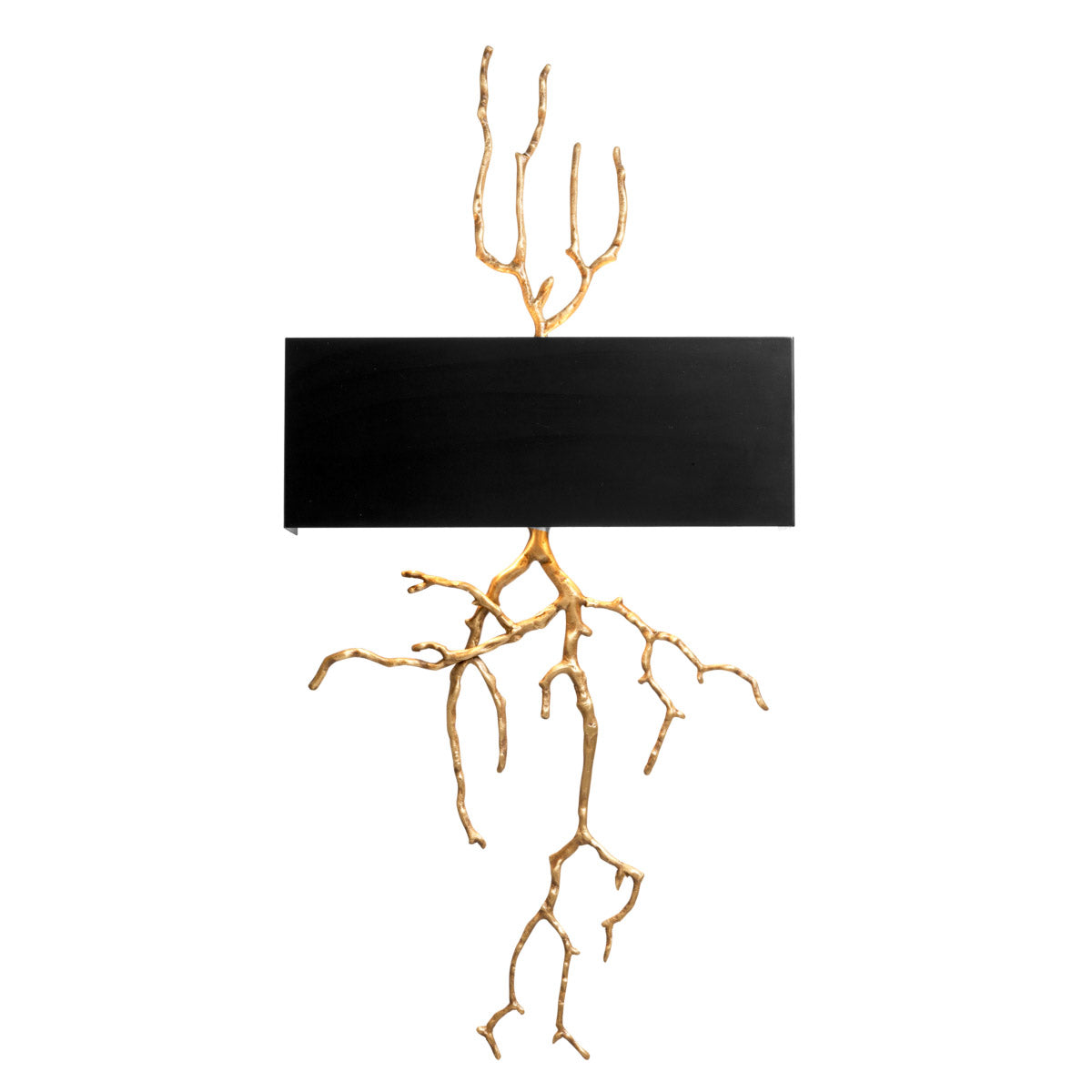 Two twig-shaped limbs appear from behind a black fabric rectangular lampshade. They are skilfully crafted from iron and provided with an antique brass finish.
